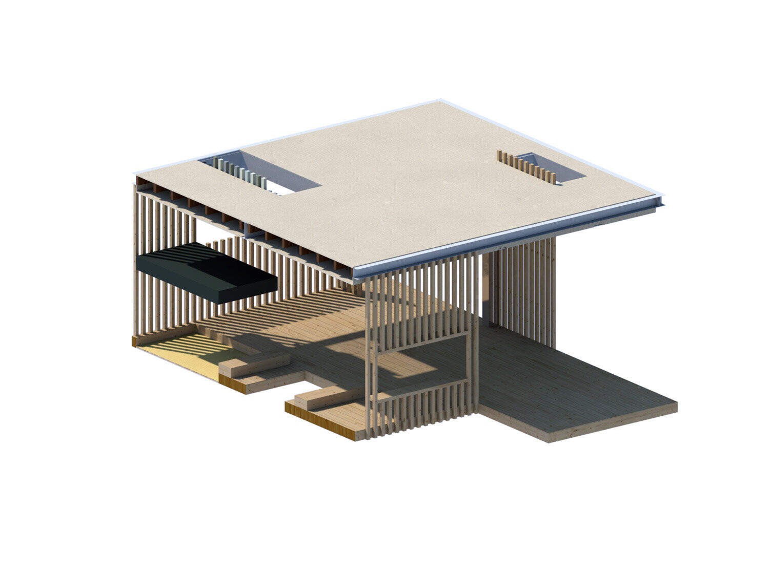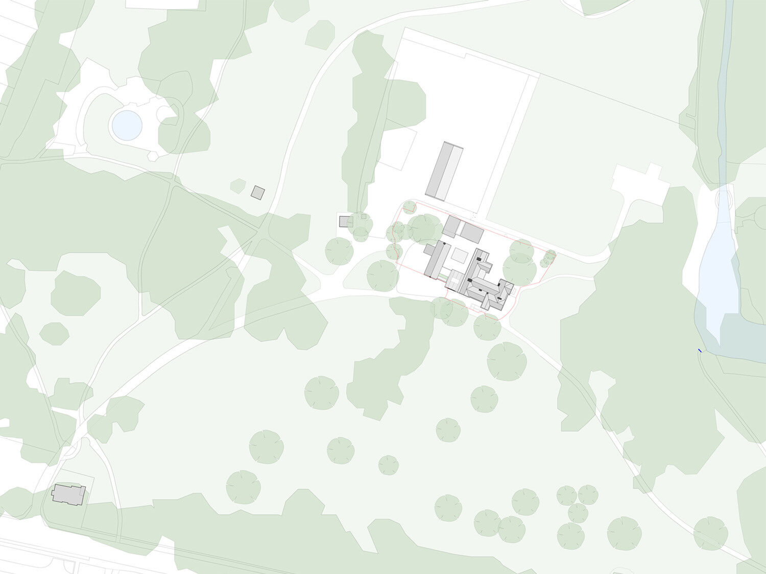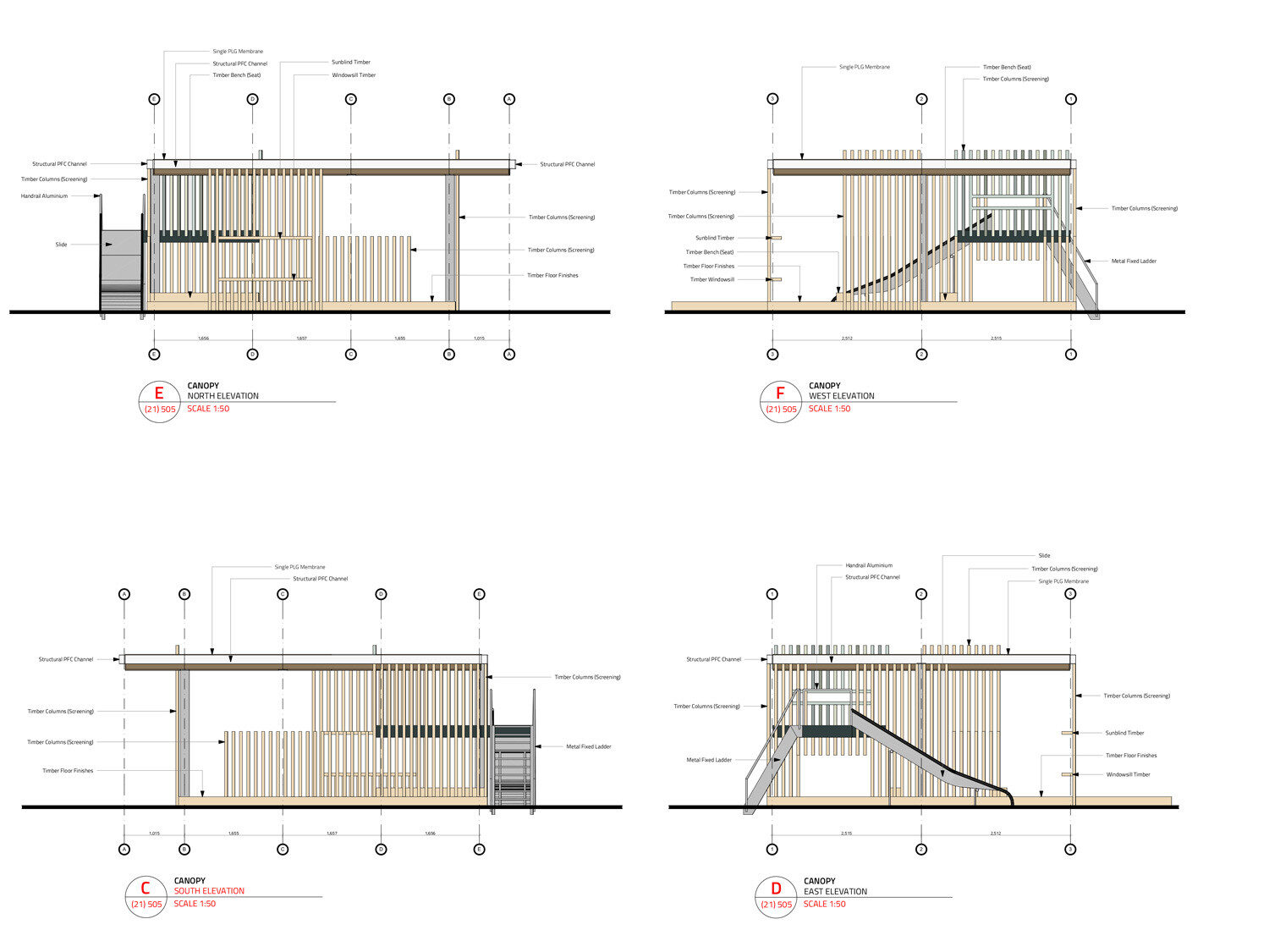 A low structure, enclosured in the courtyard, the outdoor classroom has been designed not to be visible from the surrounding parkland. Its form has been simplified to a rectilinear profile with a cantilivering roof edge that emphasizes its lighweight nature.