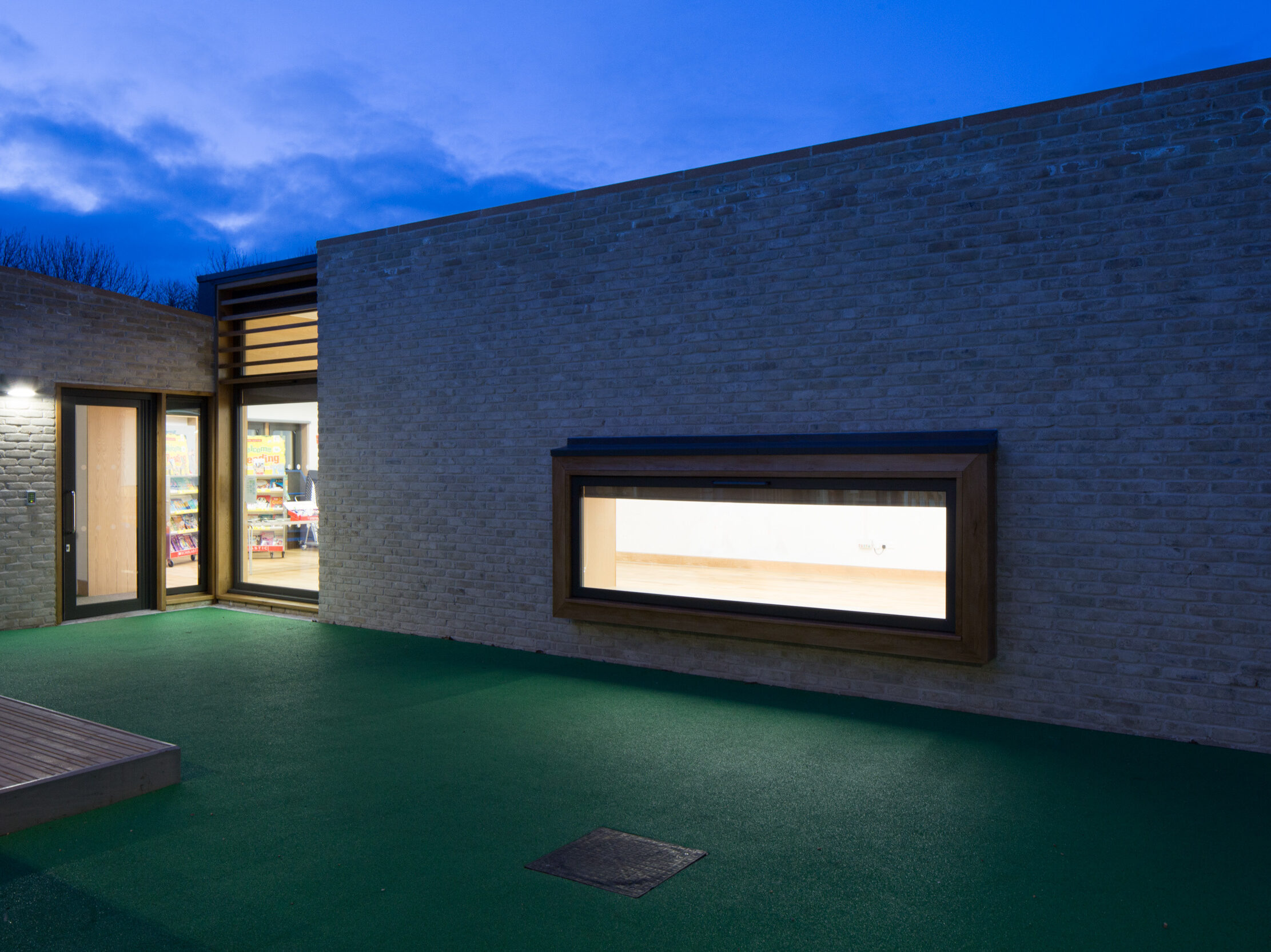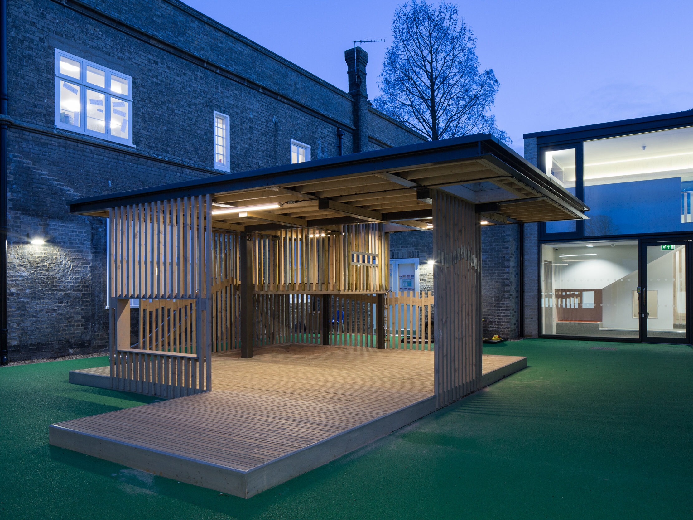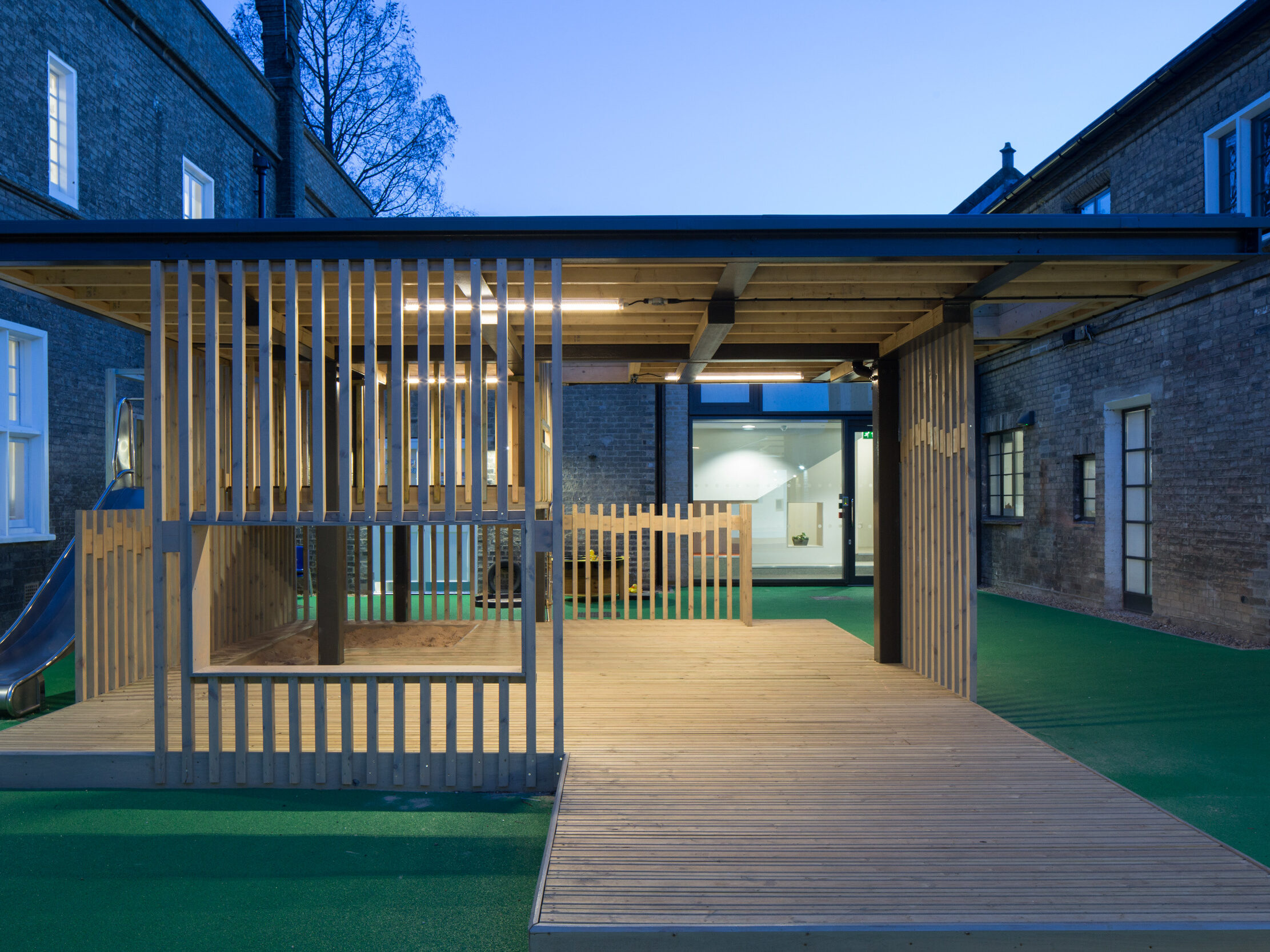 The outdoor classroom is a structure in the Early Years courtyard and was envisaged as a timber clad ‘temporary’ play-structure. It provides a covered play space with a slide and sandpit and focal point for the external landscape. A light weight structure, it was designed to contrast with the masonry boundary walls of the existing hall, cottage and proposed multi-purpose building.