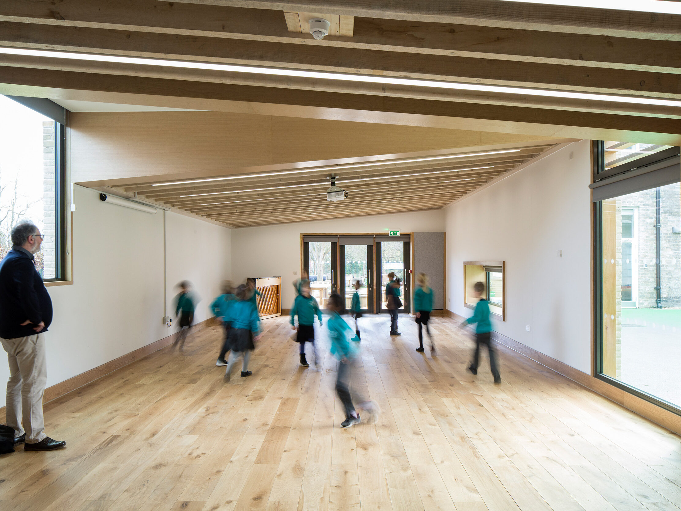 The multi-purpose building provides 100m2 of new accommodation and a large flexible open plan area. Its position helps create the courtyard and matches the cottage gable width and defines a threshold space for pupils before entering into the courtyard. Its calm brick exterior complement the brick on the Hall. Framed views provide connects across the couryard toward the glazed link.