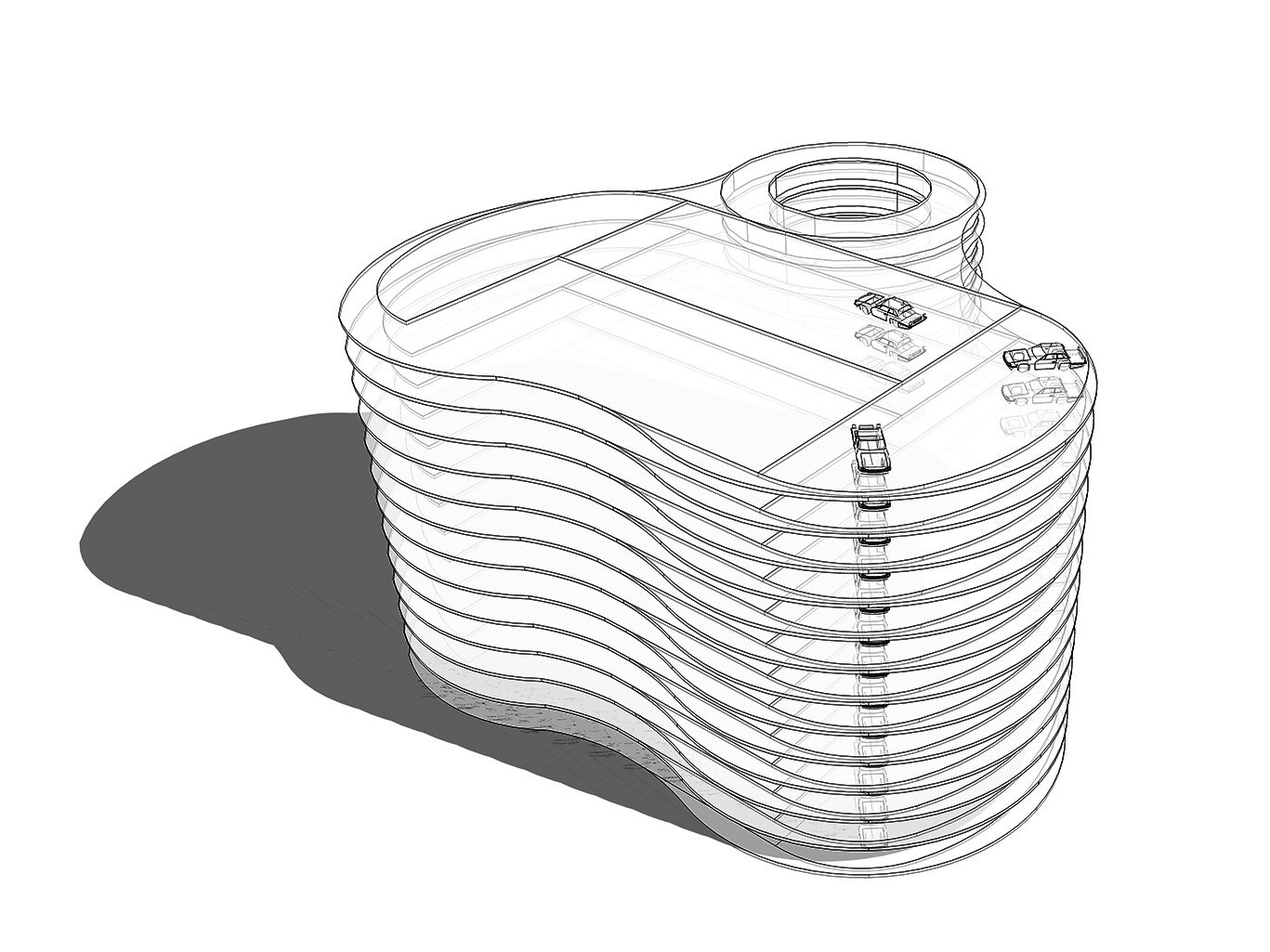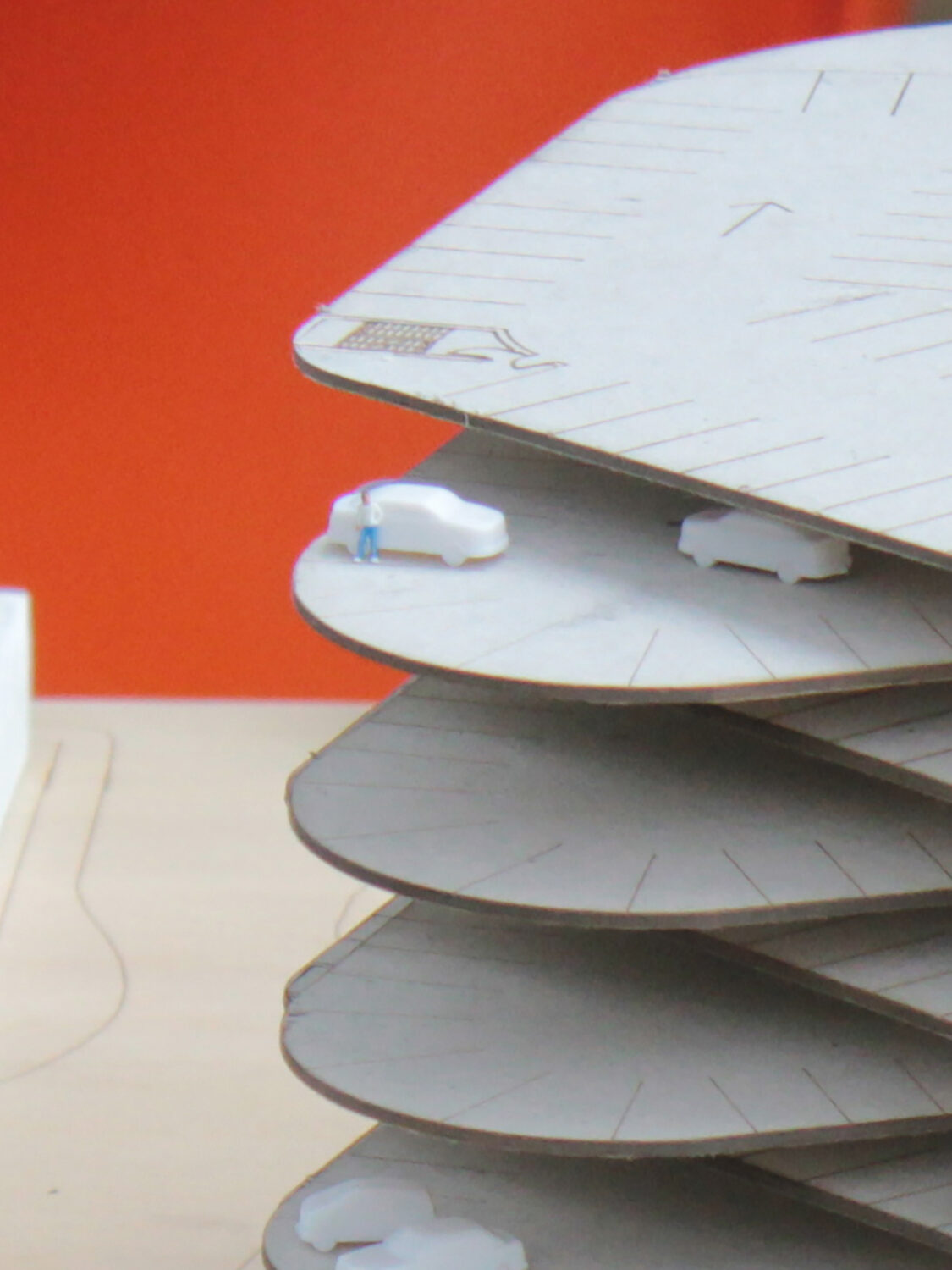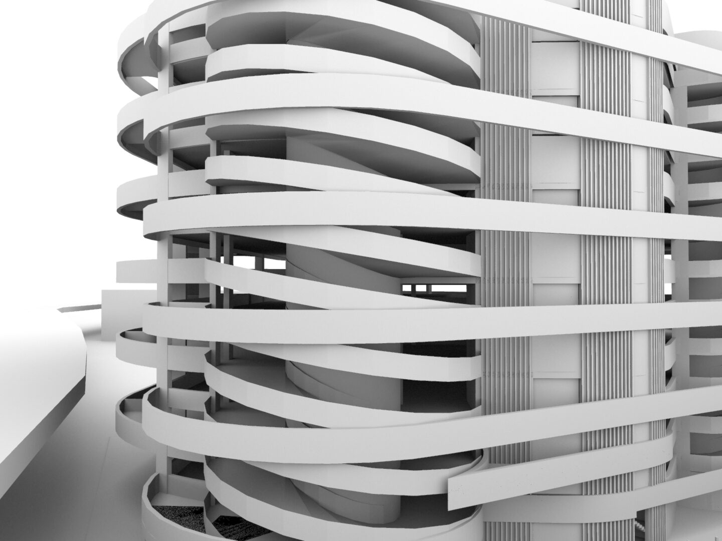 Double height carparking spaces due to offset decks reduces the overall perceived mass of the building. Increases natural daylighting internally and a reduction in overshadowing of the neighbouring buildings. A more delicate form