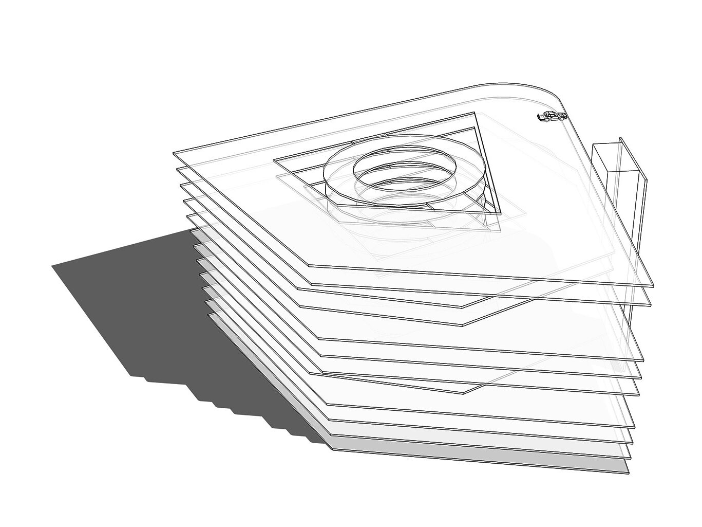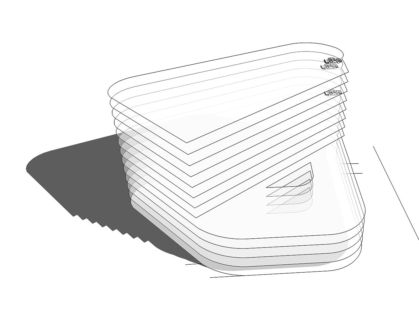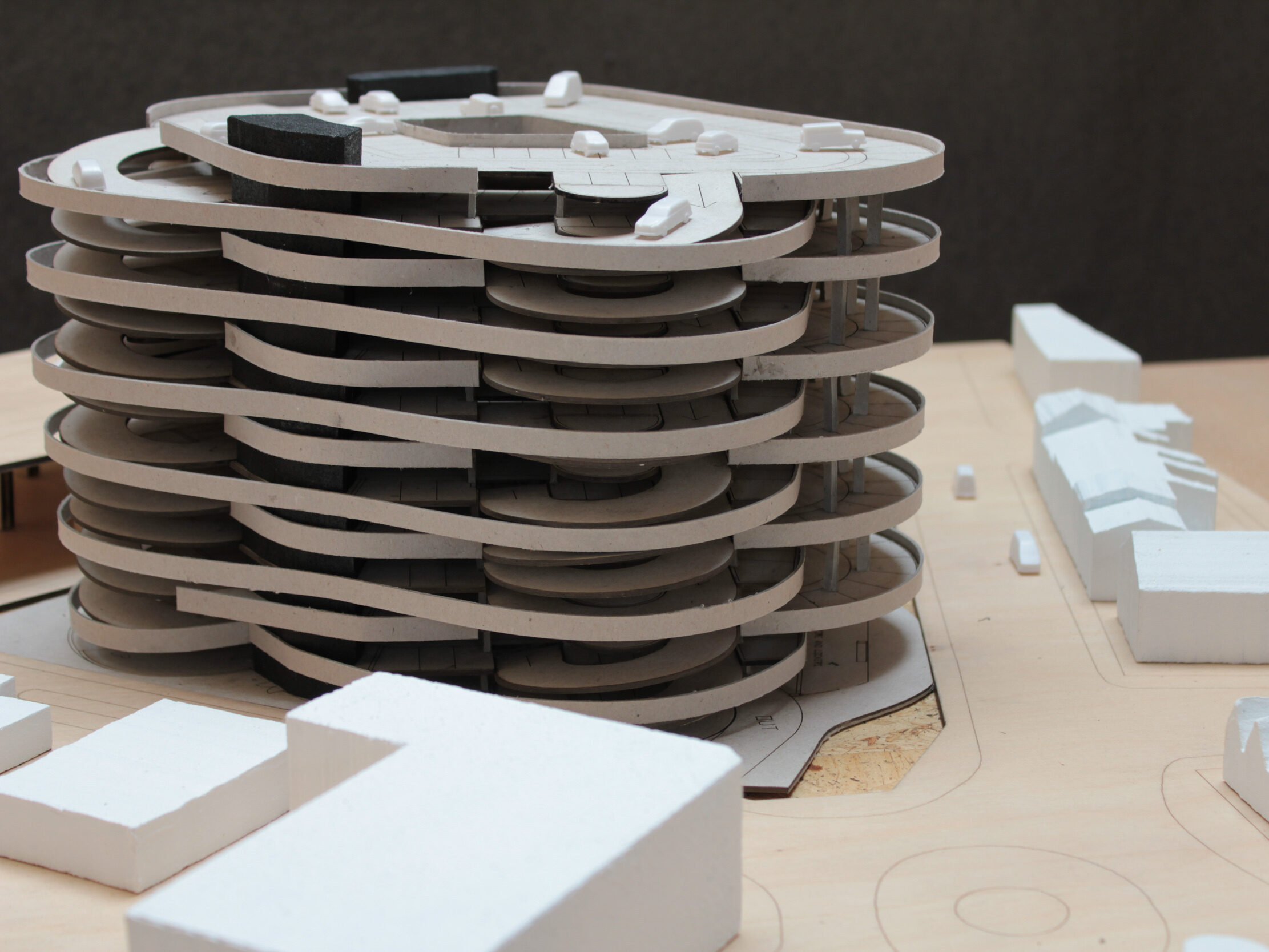 Double height carparking spaces due to offset decks reduces the overall perceived mass of the building. Increases natural daylighting internally and a reduction in overshadowing of the neighbouring buildings. A more delicate form