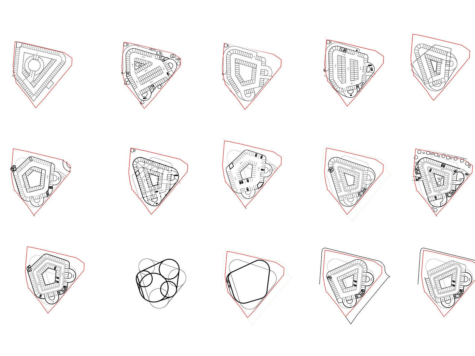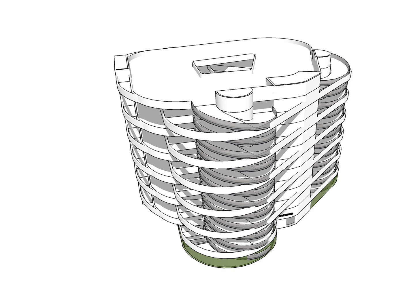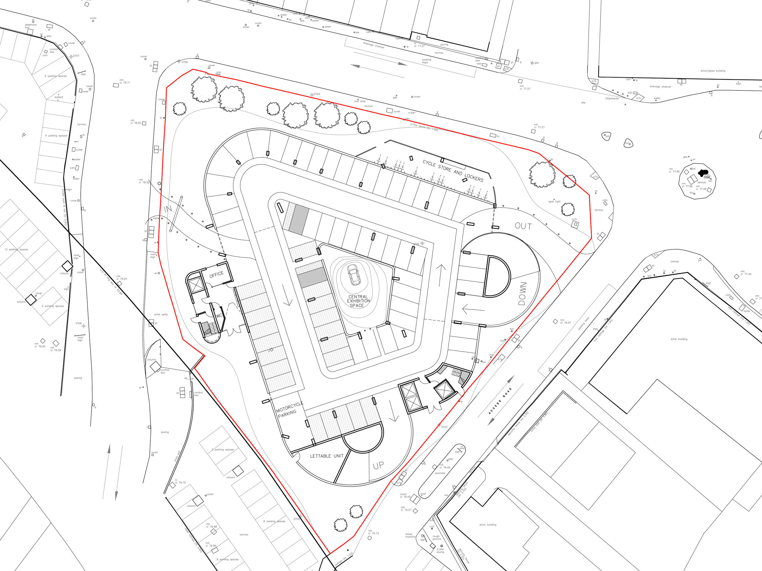 The car park is organised over 13 alternating flat deck levels with two half external ramps. The floor to floor height is 3m. Ground level and first floor level decks are the ‘triangle’ shaped floor plate, the second floor level and roof level are of the ‘square’ shape. The floors between alternate between the two.