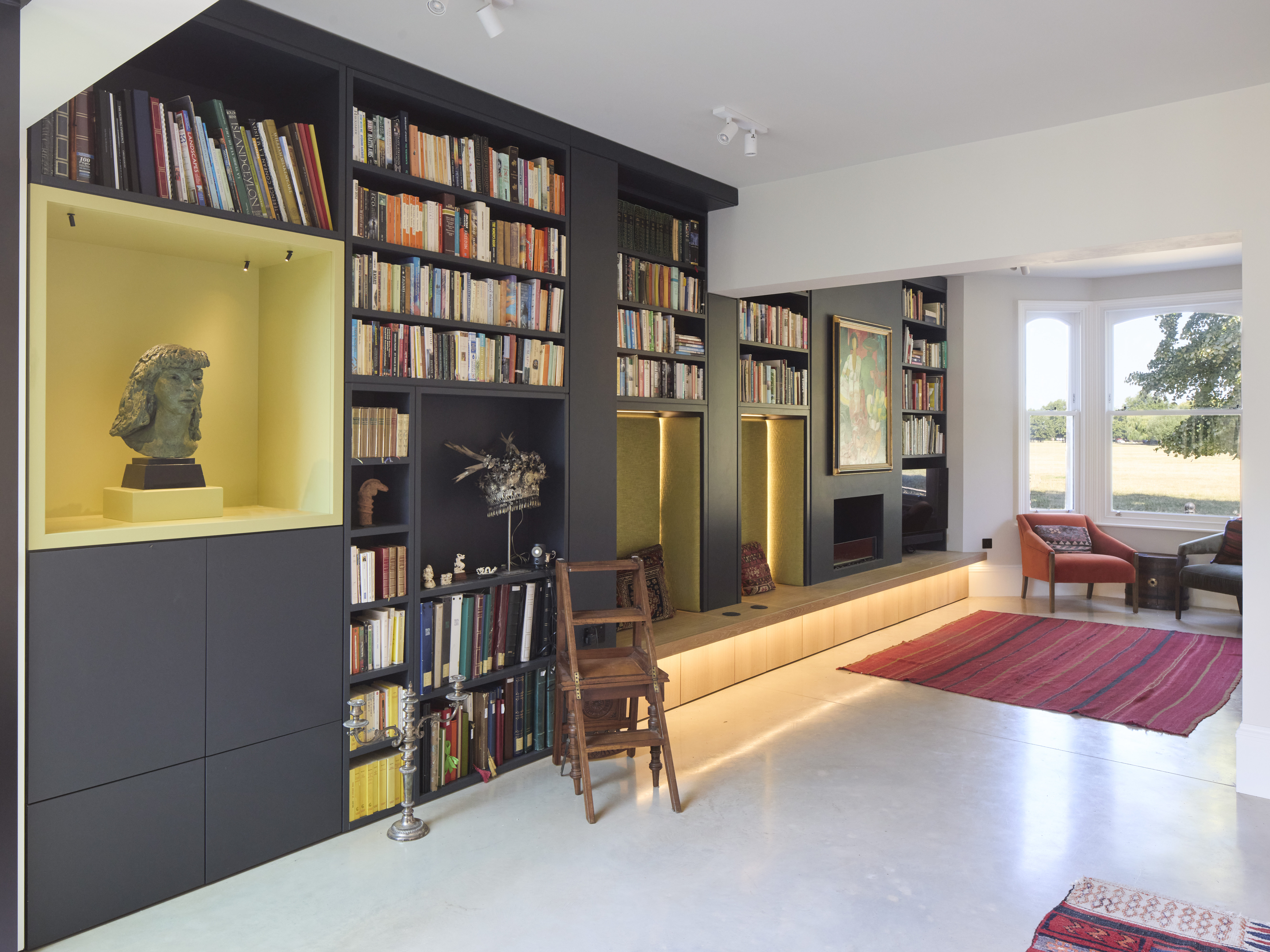 Tying togther the formal front and rear reception rooms was completed with the creation of a continuous 'Feature Wall' in a unifying dark tone. Pops of colour to key locations bring the wall to life and the concealed lighting compliments 'the look'