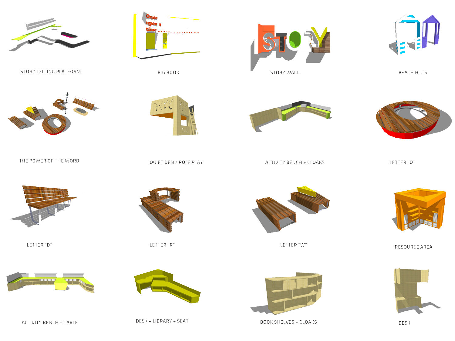 .. had to be fun and increase attraction to literature, feed the imagination , must look like an external library space when viewed from the school. create an external reach in fiction novels, create a series of small performance areas with seating, and create different rooms outside