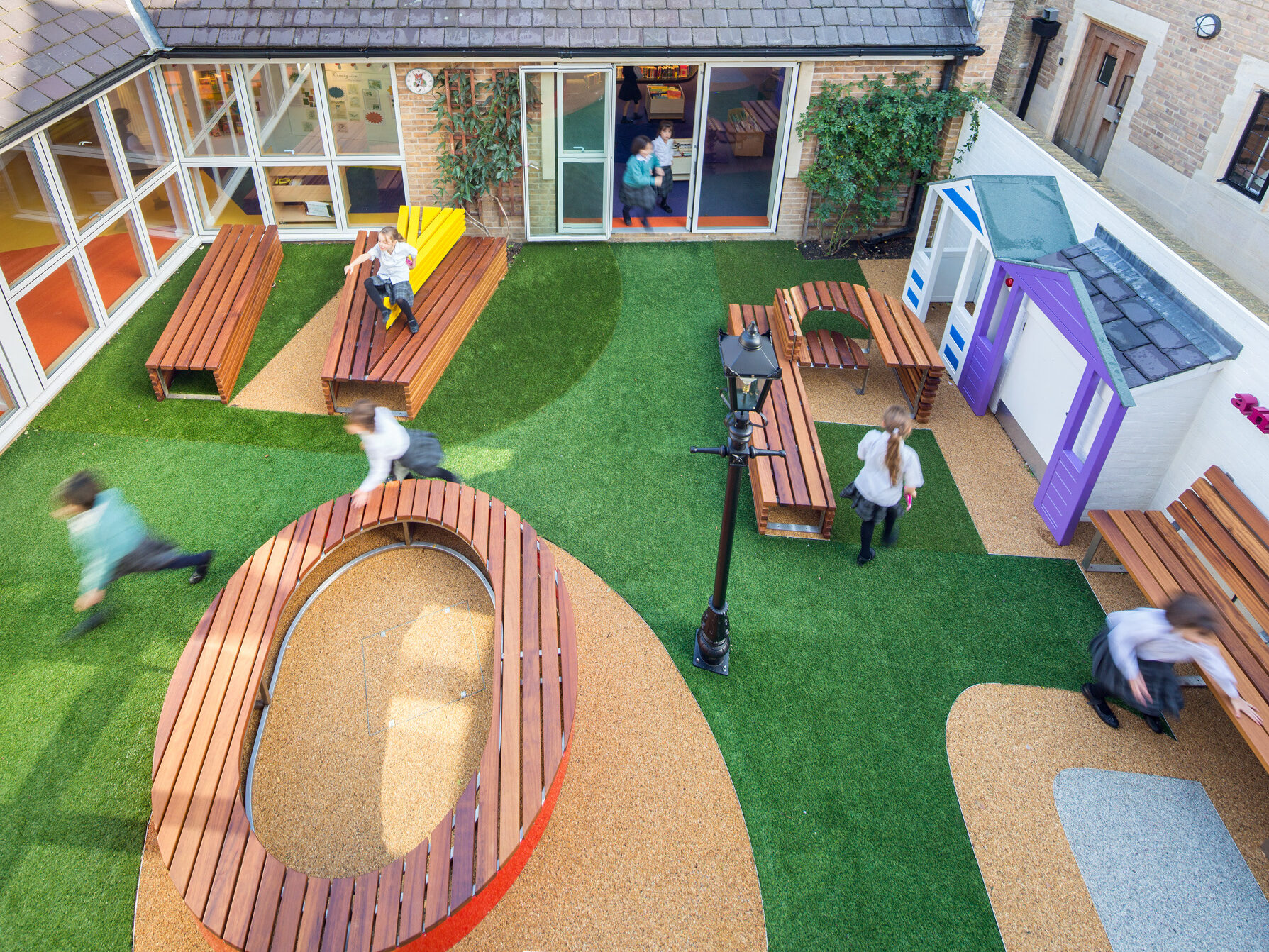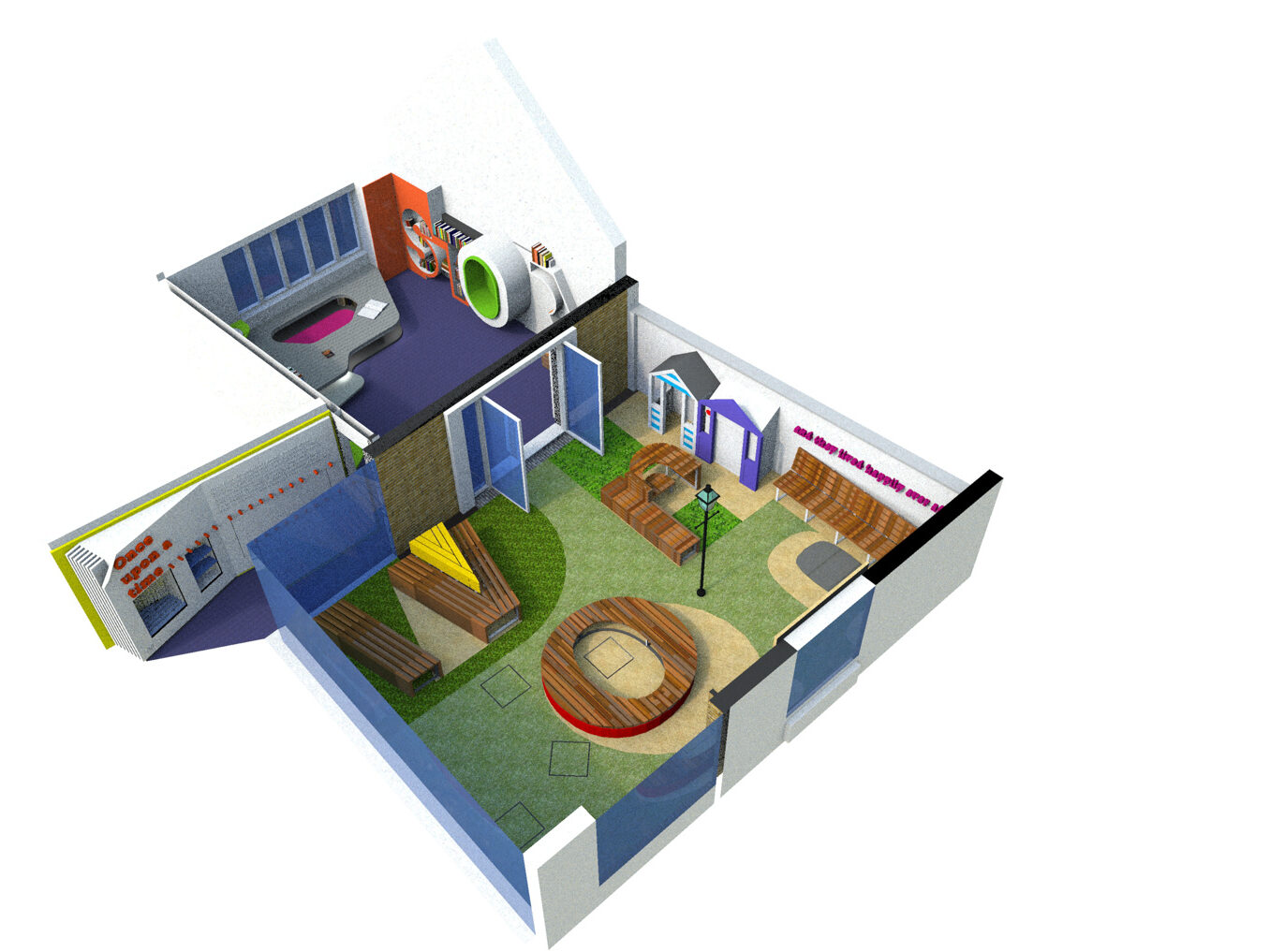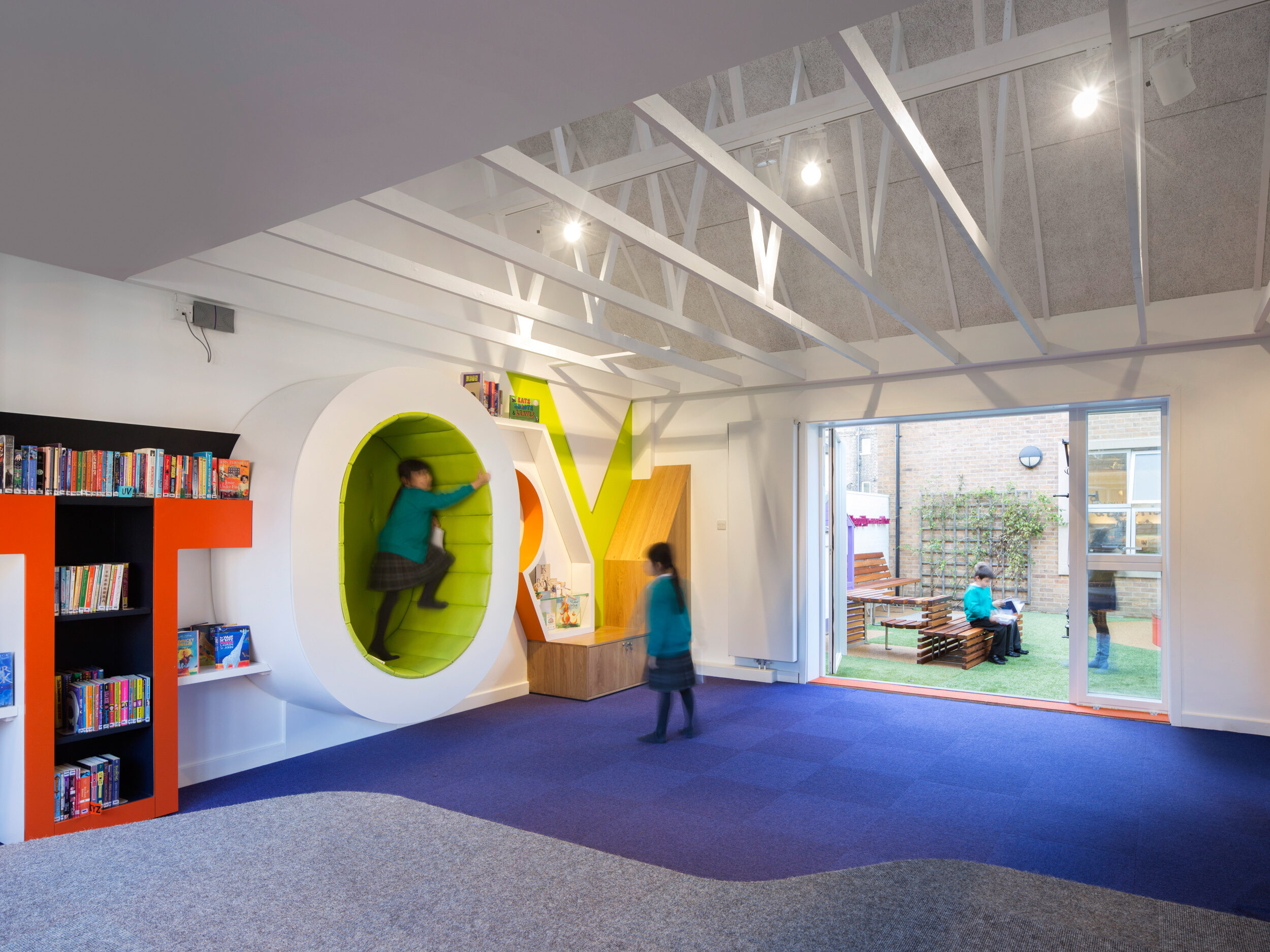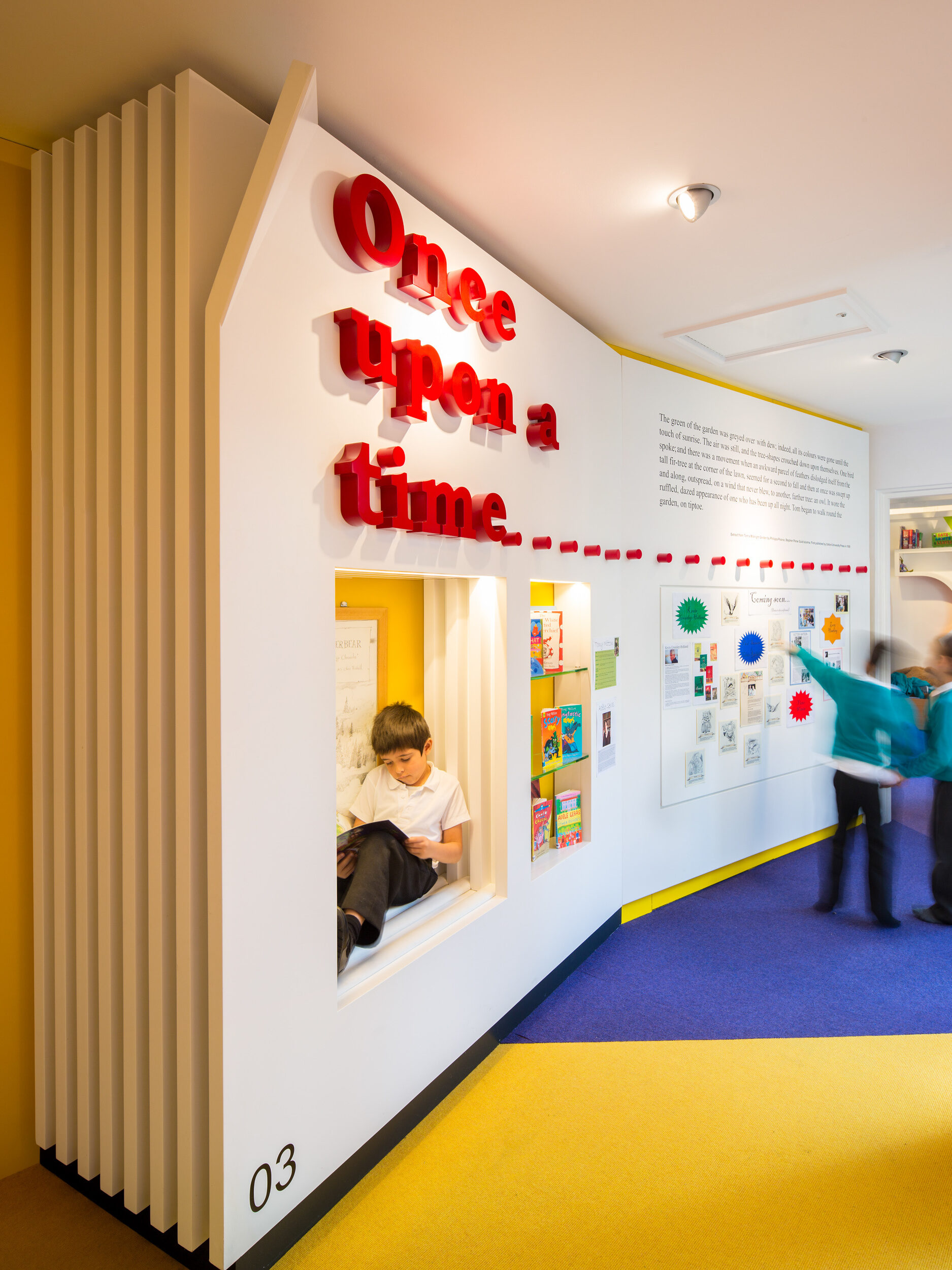 The design references a number of texts, including ‘Tom’s Midnight Garden’ and ‘The Lion, The Witch and the Wardrobe’. A habitable book signifies the presence of the storytelling spaces within the school’s corridors.