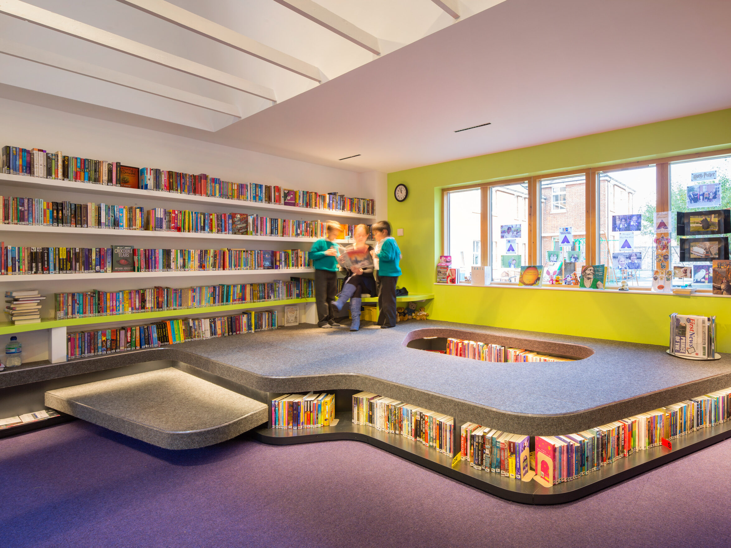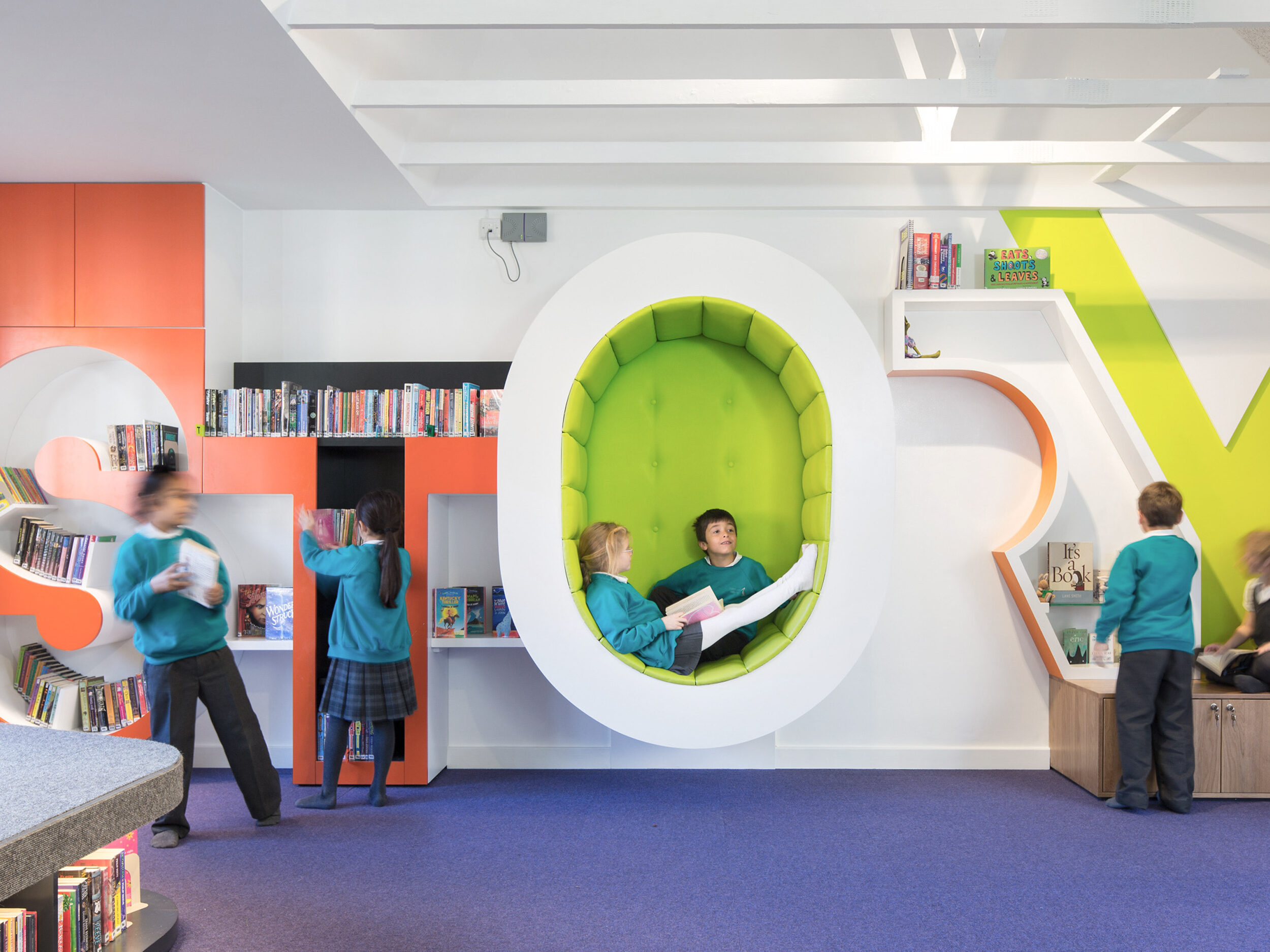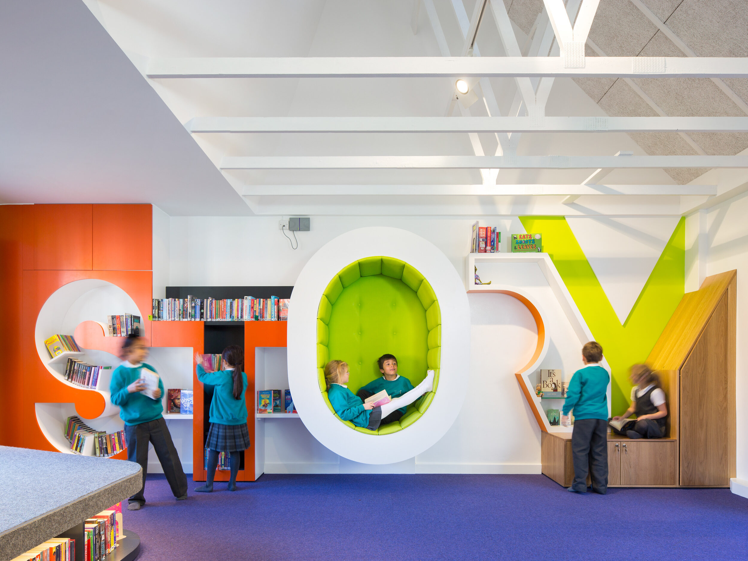 A space where books and reading are celebrated. A design that puts all the books within access of the pupils, even the youngest of pupils can explore the shelving. The joinery creates a landscape to sit and lounge and the "O" is an amazing seat for a storyteller