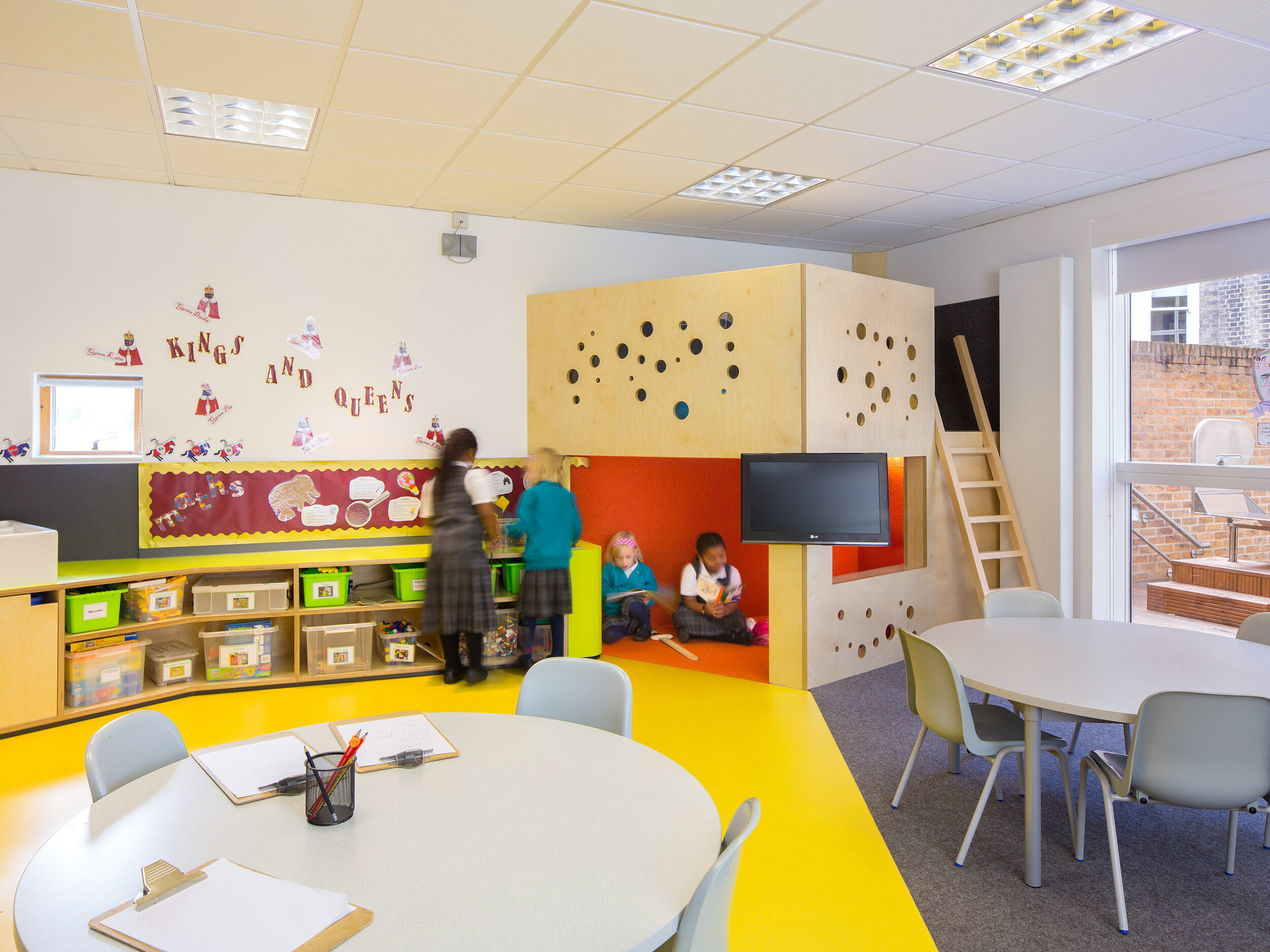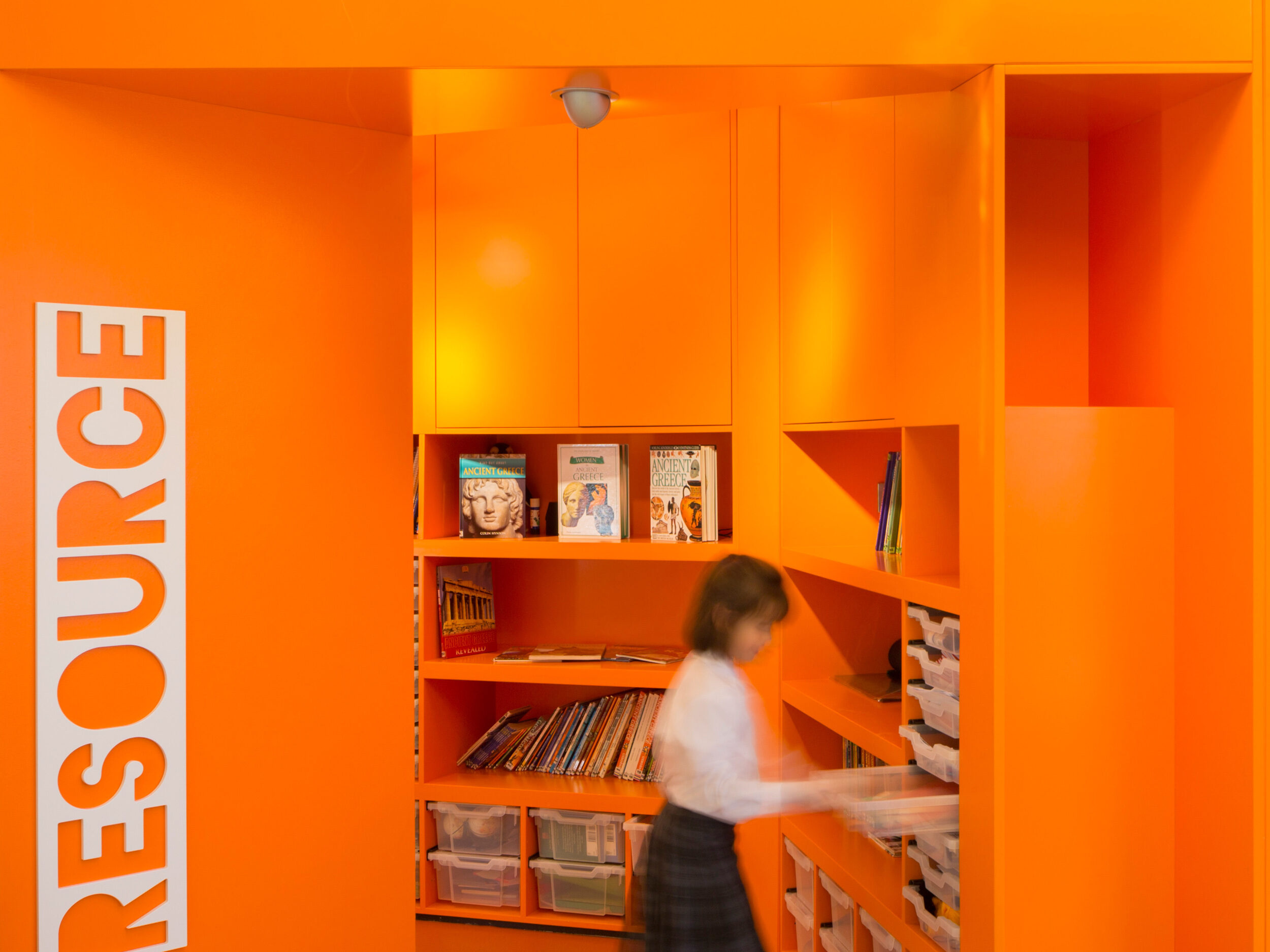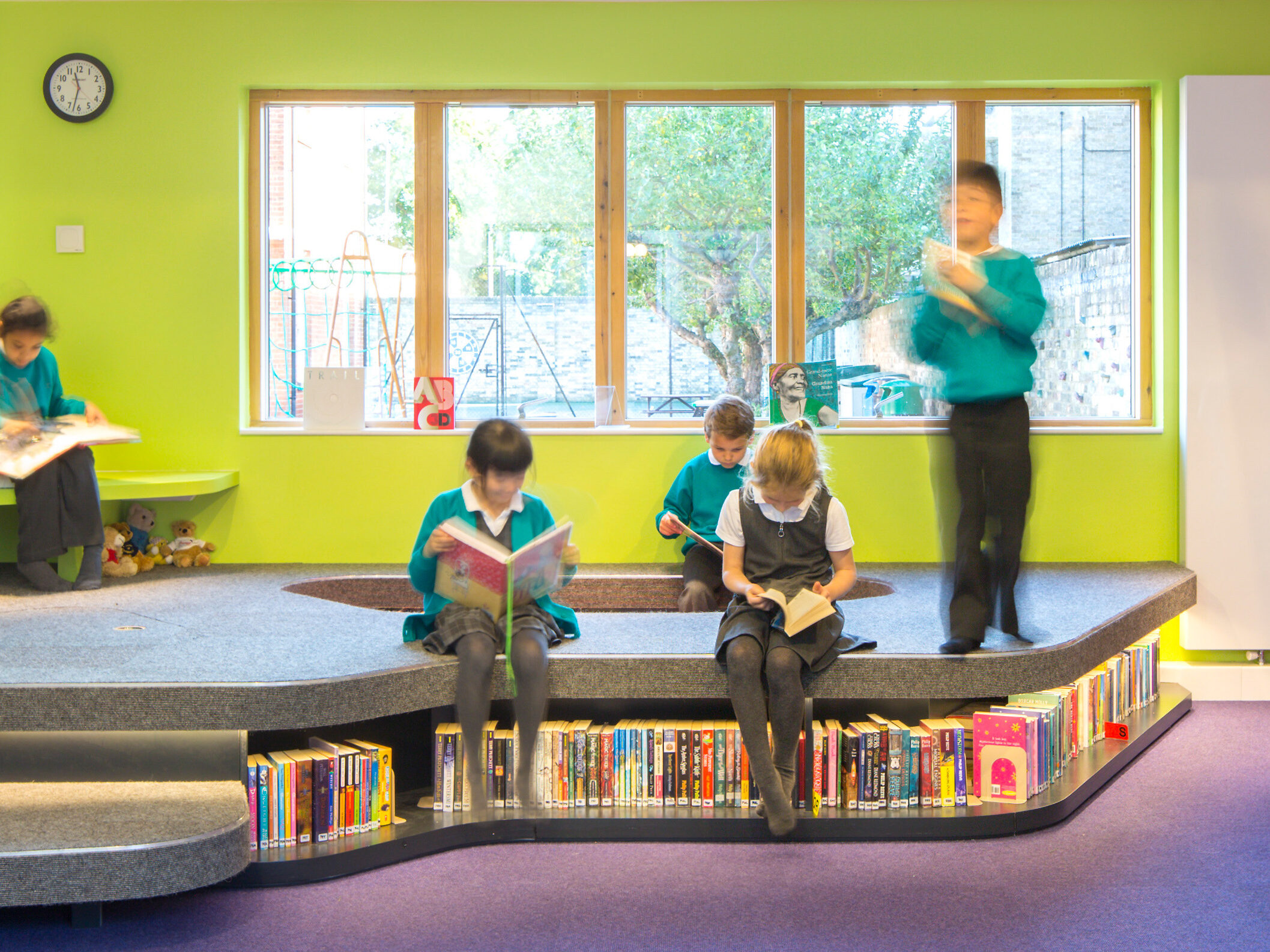 A space where books and reading are celebrated. A design that puts all the books within access of the pupils, even the youngest of pupils can explore the shelving. The joinery creates a landscape to sit and lounge and the "O" is an amazing seat for a storyteller