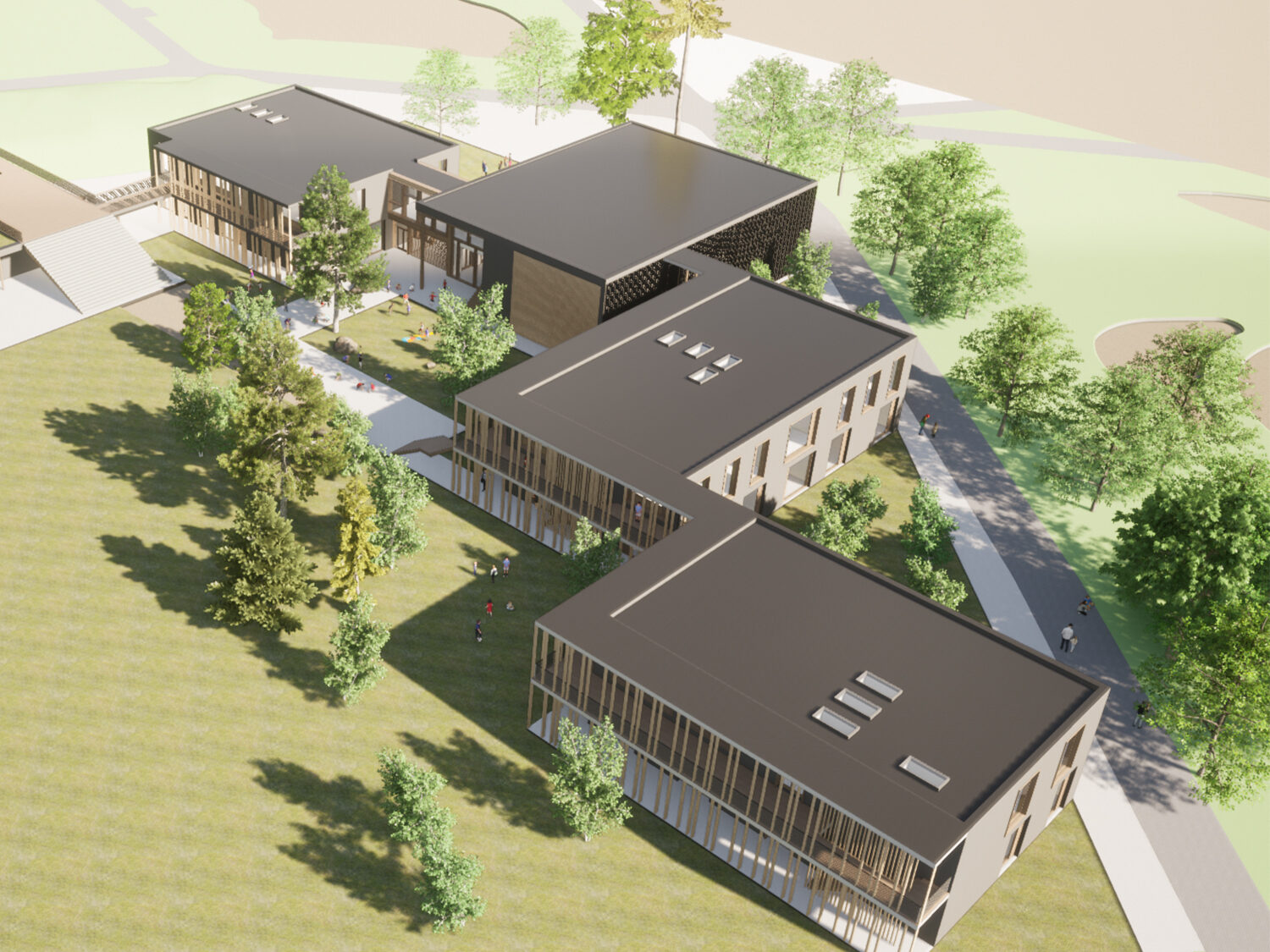 The school site sits between two areas of woodland at the northern end of the masterplan, shielded from the main road by a raised grassy bund. Our proposal works with – and celebrates – these constraints, to create a unique site-responsive school campus.