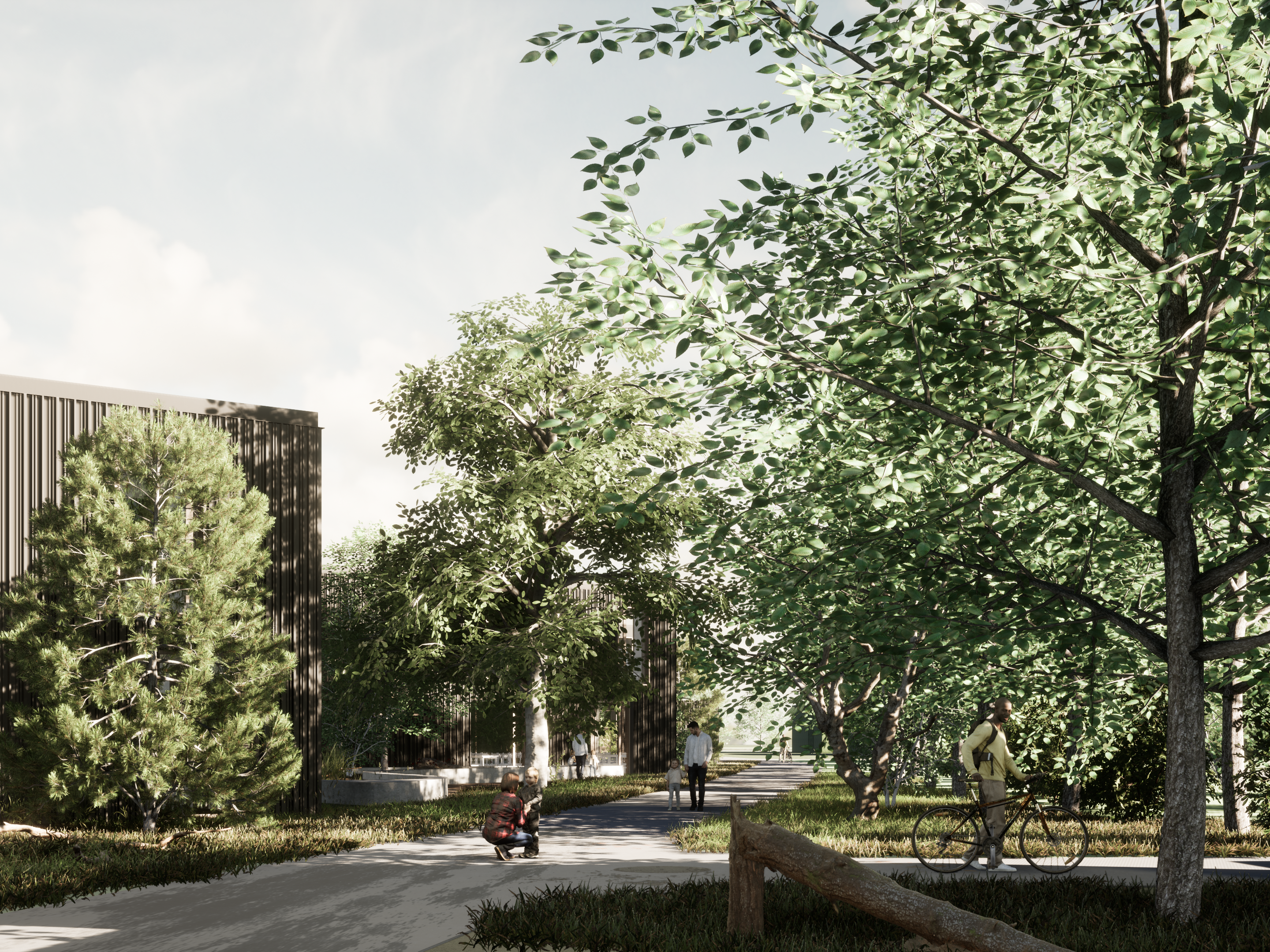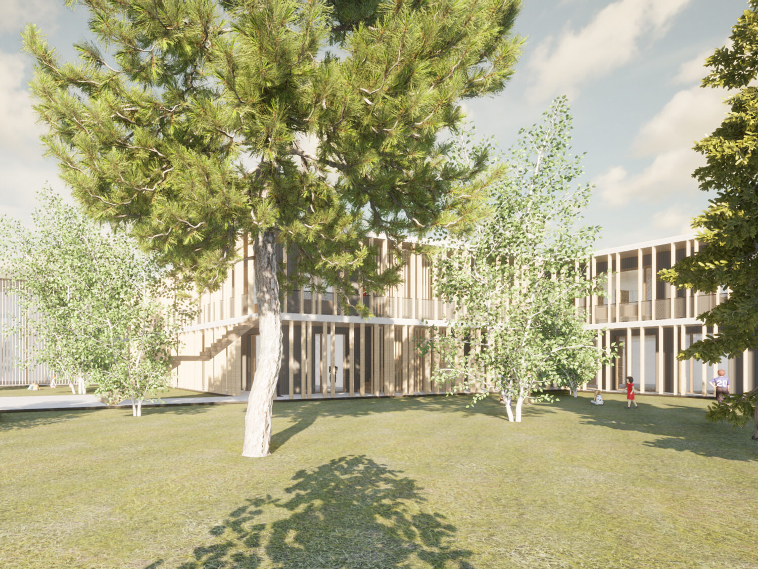 Inspired by a silver birch forest, the design proposes a covered external circulation route between pavilion building blocks with a random vertical structure. The walkway benefits from being in nature , open air and with views of the surrounding landscape and simply connecting the accommodation together.